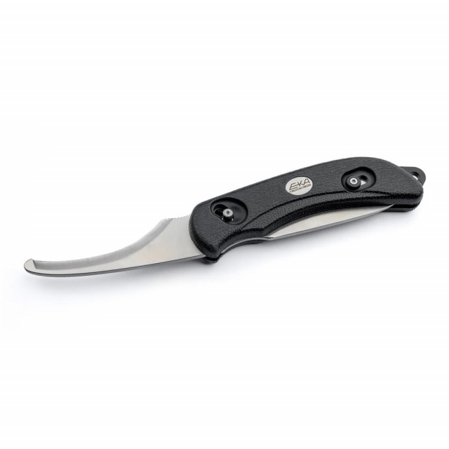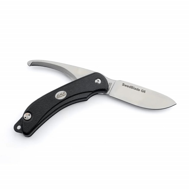 Den nye EKA® SwedBlade G6 bruker et velprøvd og testet svingbart bladdesign som gjør det mulig å bruke to forskjellige knivblader i én og samme kniv. Det er mange flotte funksjoner som bidrar til å gjøre EKA® SwedBlade G6 til den ultimate kniven. Den har et veldesignet, ergonomisk formet håndtak. Knivbladene er laget i ett stykke av det svenske stålet 12C27, noe som bidrar til lang holdbarhet og slitesterke egger som holder seg skarpe. Du kan raskt bytte mellom flåbladet og sløyebladet med en enkel, flytende bevegelse når låseknappen trykkes inn. Den har også et festeøye for en snor, slik at EKA® G6 ligger trygt i hånden mens du bruker den.
