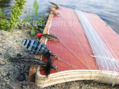 Krokstorlekarna varierar men är både 6 och 8. Ibland 10 och 12. Visst finns det billigare linor på marknaden än denna, men då kommer först och främst inte flugorna från Sverige. De håller knappast lika länge, stålkvalitén i krokarna är skit i jämförelse. Jag använder dyra, rejäla från Mustad. Bronserade öring dubbel och små svarta lax dubbel. Flugorna på andra fabrikat är heller oftast inte lackade, vindan är en frigolitring eller något annat skräp, men utterlinan är framförallt inte ett omsorgsfullt handgjort fiskeredskap. Här är flugorna uppbundna och beprövade för Norrländska sjöar och deras fettfenade fiskar!