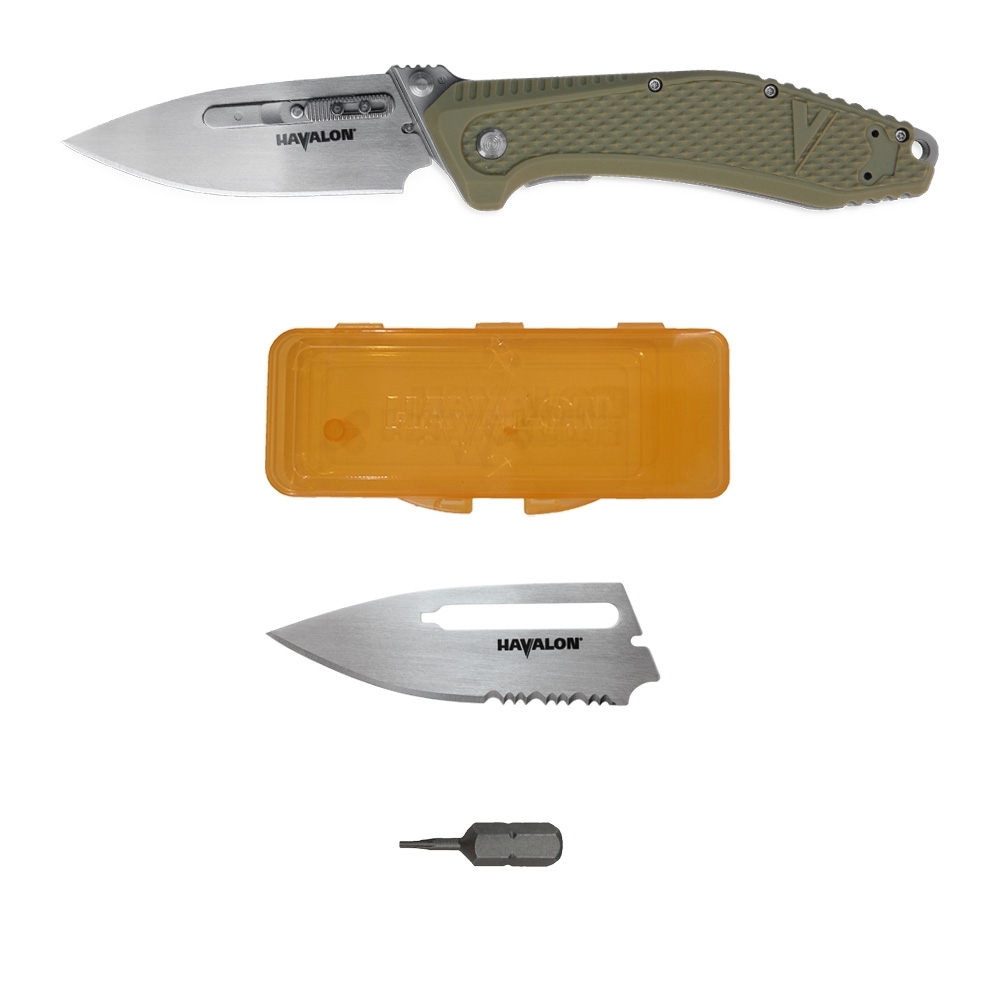 REDI™ har to semi-permanente drop point-blad (ett delvis takket) som enkelt kan byttes ut når jobben krever det. I motsetning til andre Havalon-kniver er REDI-knivene laget for å slipes på nytt og er beregnet på å brukes i årevis.