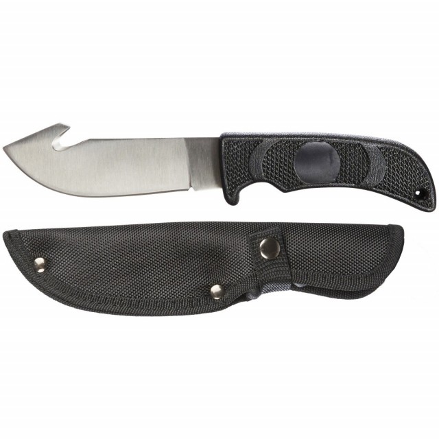 Denne jaktkniven er en kraftig og robust kniv som tåler hard behandling. Kniven har et 11,5 cm langt blad i rustfritt stål og et grepsvennlig, sort gummiert skaft med sklibeskyttelse for fingre. På bladets overside er det en bukåpner for utvomming av dyr. Jaktkniven leveres med en sort slire i nylon med beltefeste og trykknapp for sikring av kniven. Svært enkel å vaske og rengjøre etter bruk.
