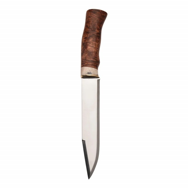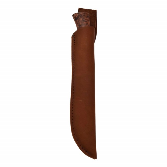 Stor stikkniv med langt blad i rustfritt stål og komfortabelt håndtak i oljet masurbjørk. Ved siden av skaftet er det et bredt bånd av reinsdyrgevir som står i fin kontrast til messingen. Denne store, håndlagde jaktkniven leveres med en praktisk, håndlaget knivslire i skinn med beltefeste som gjør det enkelt å henge den på beltet når du er ute på tur.