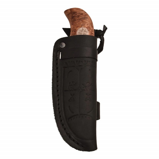 Vuonjal er det samiske ordet for en to år gammel reinsdyrhunn. Denne elegante, håndlagde jakt- og friluftskniven er vår versjon av en EDC-kniv, med en størrelse og slire som gjør at du kan ta den med deg overalt. Innlegget i reinsdyrhorn er en stilig detalj i håndtaket, som ellers er både elegant og behagelig å holde. Den dekorerte knivsliren i brunt skinn kan festes på flere måter slik at den er lett tilgjengelig, men ikke i veien. Den kan for eksempel festes vertikalt og horisontalt i beltet eller på en ryggsekk.