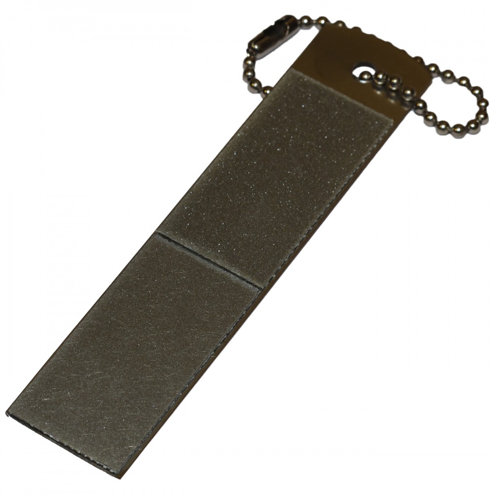 Et bryne (9 x 2 cm) som inneholder diamanter (to korninger) på en meget tynn skive av rustfritt fjærstål.