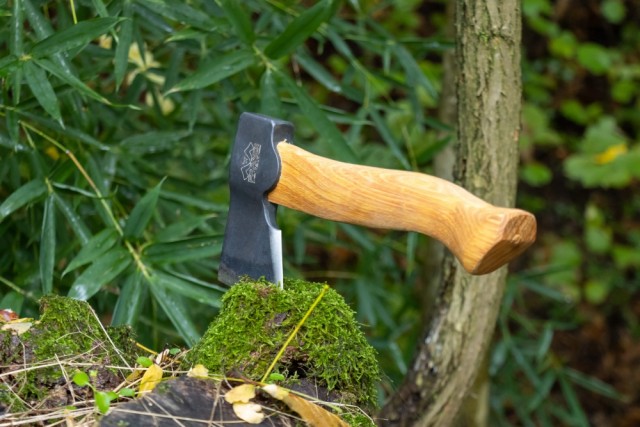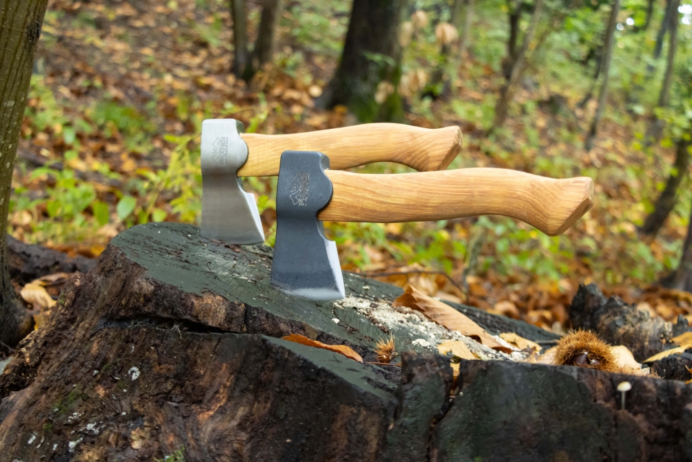 Håndlaget italiensk turøks med hickoryskaft og blad i herdet og polert karbonstål.