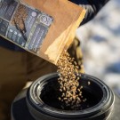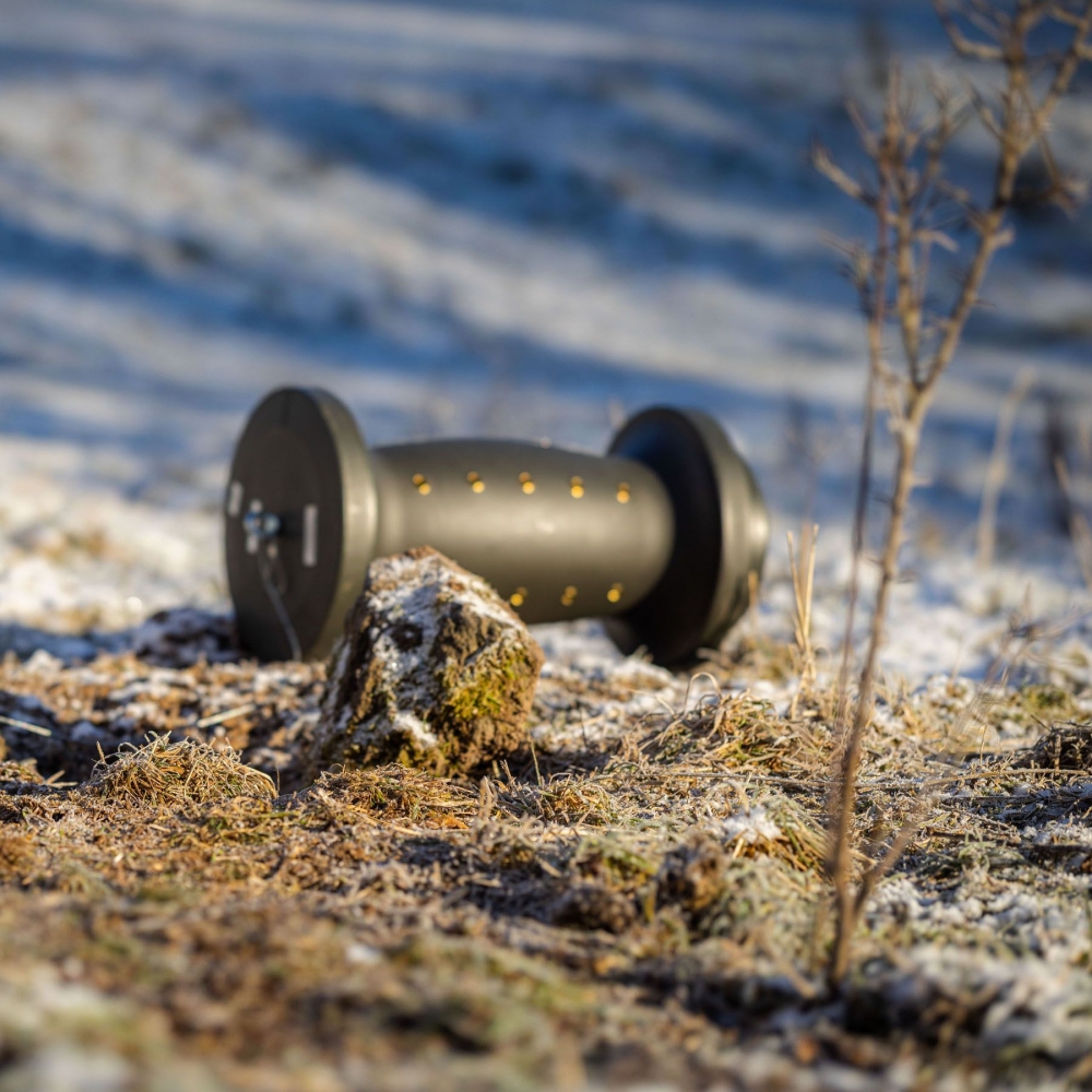 Nyutviklet fôringstrommel med en kapasitet på 38 kg, bruddsterk og slagfast, med festetau og bakkeanker, utgangshullene er robuste og forsterket med messingringer, kan enkelt og raskt fylles takket være hurtigkoblingen.