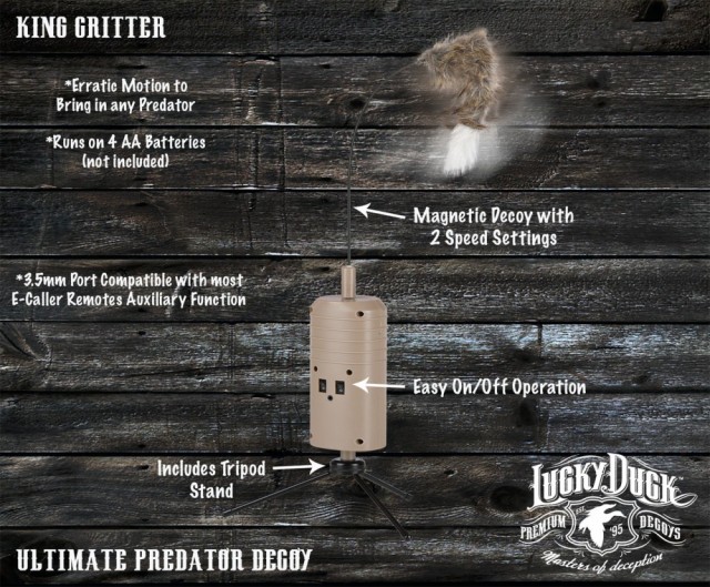 King Critter er den ultimate predatorlokken, og er laget for å takle ekstreme forhold. Med uforutsigbar og ujevn bevegelse fra den magnetiske lokken, er den dømt til å bringe inn rovdyr. King Critter har 2 hastighetsinnstillinger for lokken, og inkluderer et tripodstativ som er perfekt for alle terrenger. Det er også en 3.5mm port kompatibel med de fleste e-caller fjerkontroller med aux-funksjon. Kjører på 4 AA batterier (ikke inkludert).