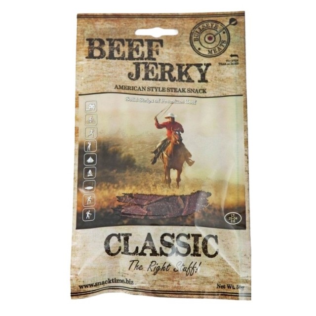 Vårt Bulls Eye Meat Beef Jerky er smakfullt, høyt i protein, lavt i fett og er laget av solide strimler av mørt biffkjøtt.
