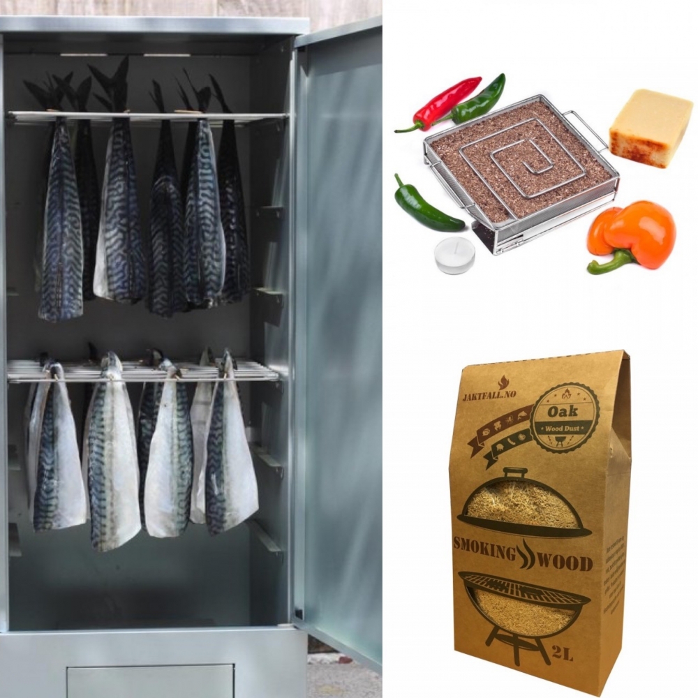 Kaldrøykepakke, komplett røykskap i metall, kaldrøykgenerator og trestøv