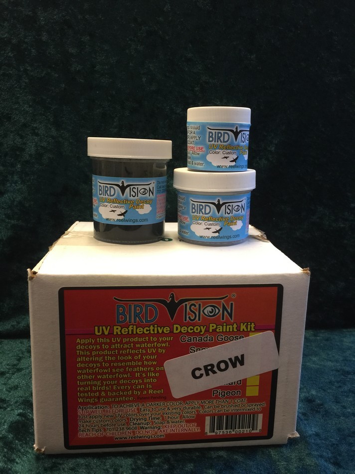 Bird Vision UV-paint Kråke Artikkelnr.: 94 Slitte lokkefugl blir som nye med litt UV-Maling! PrisNOK399,00 inkl. mva. På lager Kjøp Ønskeliste Vipps hurtigkasseKjøp nå med Vipps hurtigkasse Del dette Produktinfo Bird Vision paint. Bird Vision UV paints are water based latex paints this makes applying to your decoys a snap! You can spray it, brush it or use a small roller.... best of all... you just clean up with soap and water!