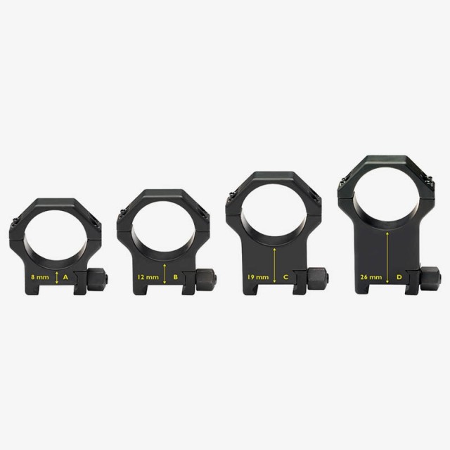 Et par herdede stålringer for picatinny- eller weaverskinner. Designet for å sikre holdbarhet, stabilitet og garantert retur til nullpunkt. Ringene kan utstyres med 5 mm rekylstopp for Picatinny-skinner eller 4 mm rekylstopp for Weaver-skinner.
