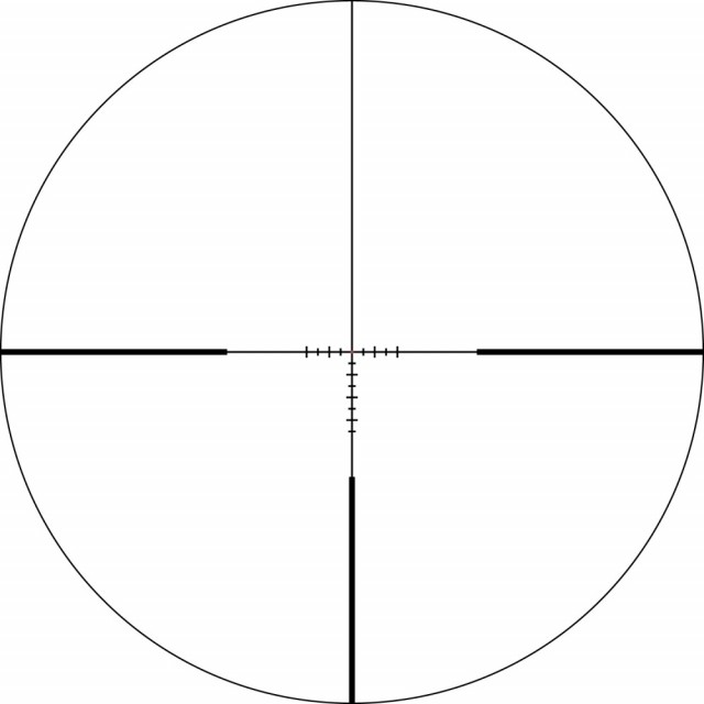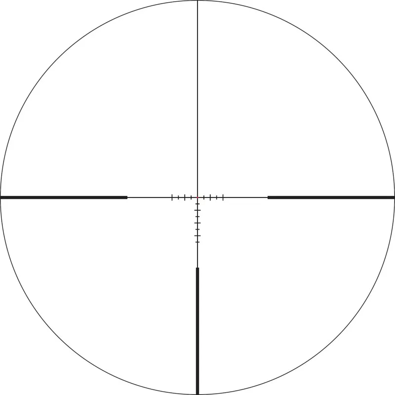 Hash-merket trådkors med MRAD-baserte subtensjonslinjer for korrigering av avstand, holdover og vindretning.