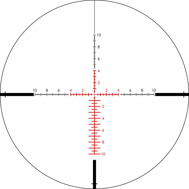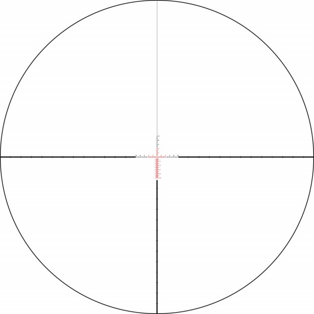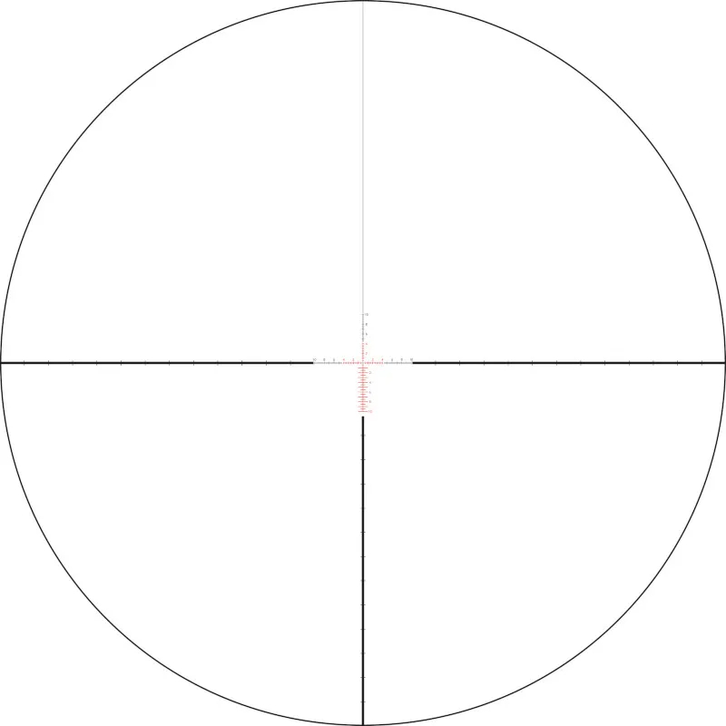 Hash-merket trådkors med MRAD-baserte subtensjonslinjer for korrigering av avstand, holdover og vindretning.