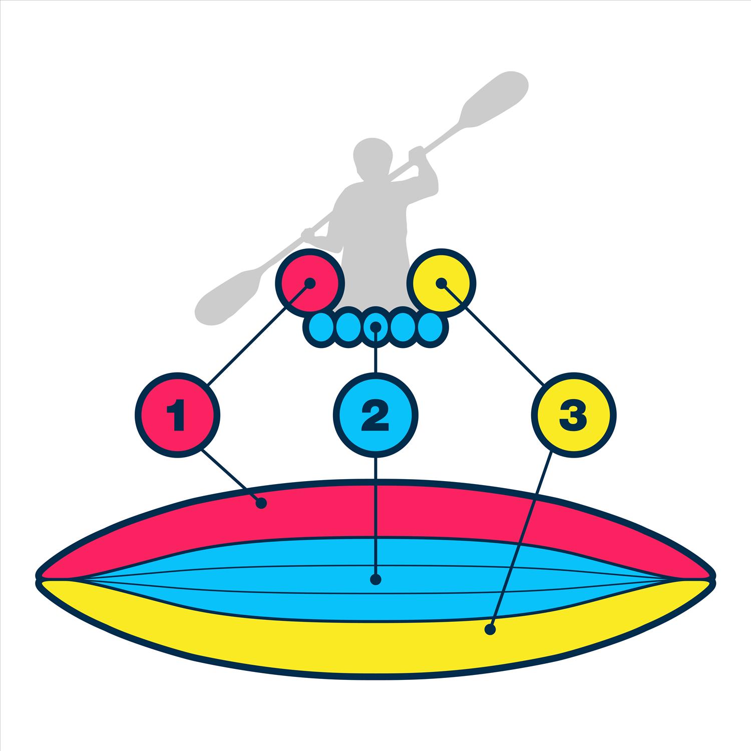 For flere år siden endret vi gulvkonstruksjonen vår fra et I-bjelkegulv med 7 rør til 5 rør. Dette forbedret padleegenskapene til Sport-kajakkene våre betraktelig, fordi padleren sitter høyere og mesteparten av vekten bæres av gulvet i stedet for av sidekamrene.