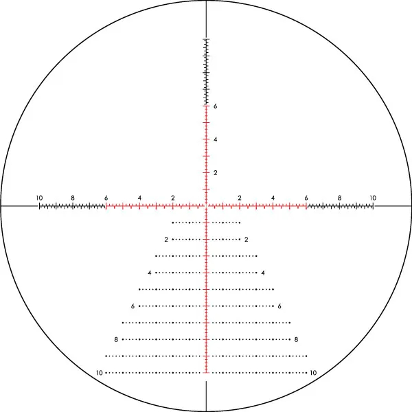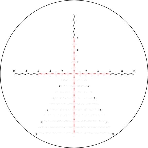 EBR-7D er fullpakket med nyttige subtensjonsdata for skyting på lange avstander, og er et hashmerket, avstandsgivende retikkel som er tilgjengelig i det første fokusplanet. Et windage-tre i de to nederste kvadrantene er perfekt for raske oppfølgingskorreksjoner for både vind og elevasjon. Kryssplex-belysningen gir bedre brukervennlighet ved lavere forstørrelse.